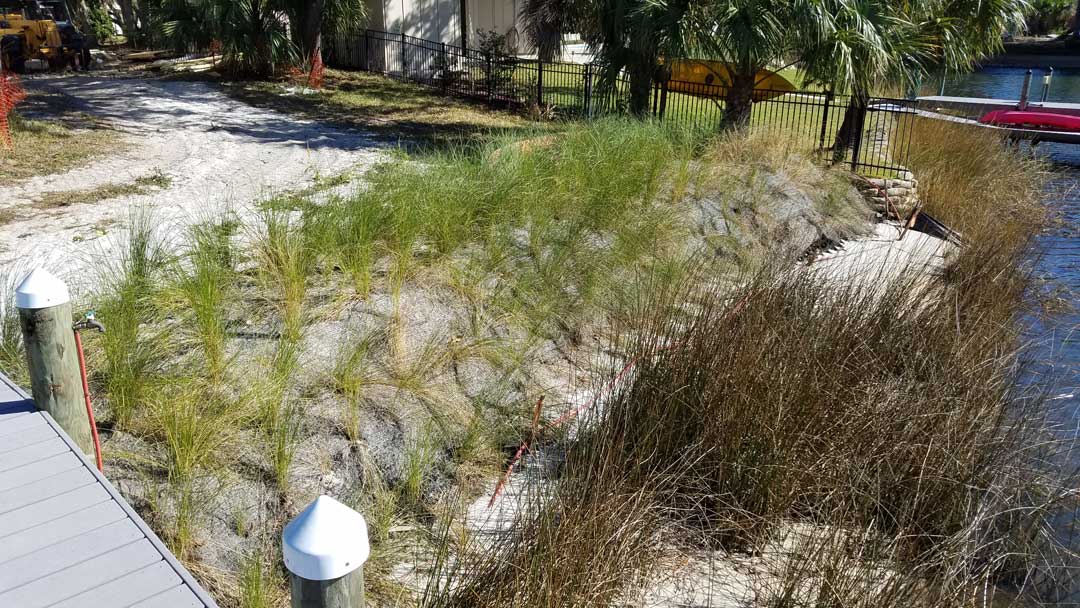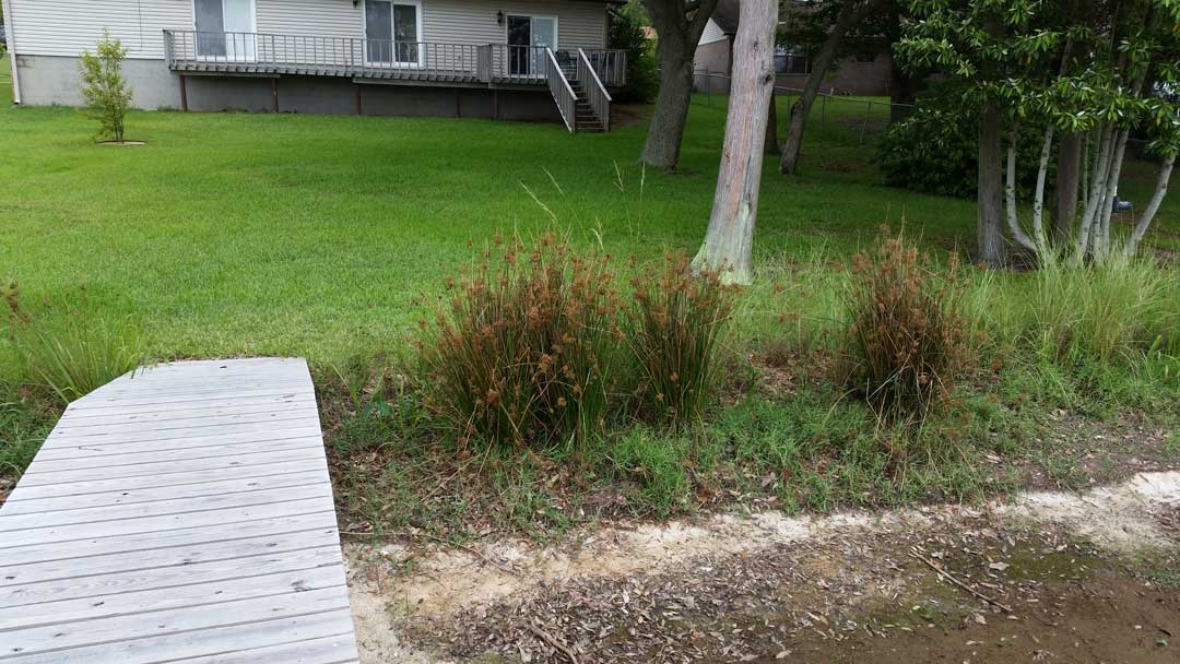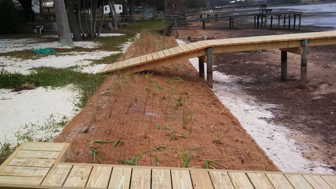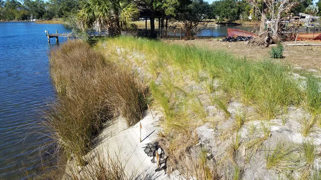 Try out a natural approach to preventing shoreline erosion with living shorelines. Living shorelines takes adavantage of native plants to establish root systems to prevent erosion. This is often paired with small reefs placed in front of the vegetation mixed with oyster shell and rock. These reefs help to weaken wave energy and provide a good habitat for aquatic species.