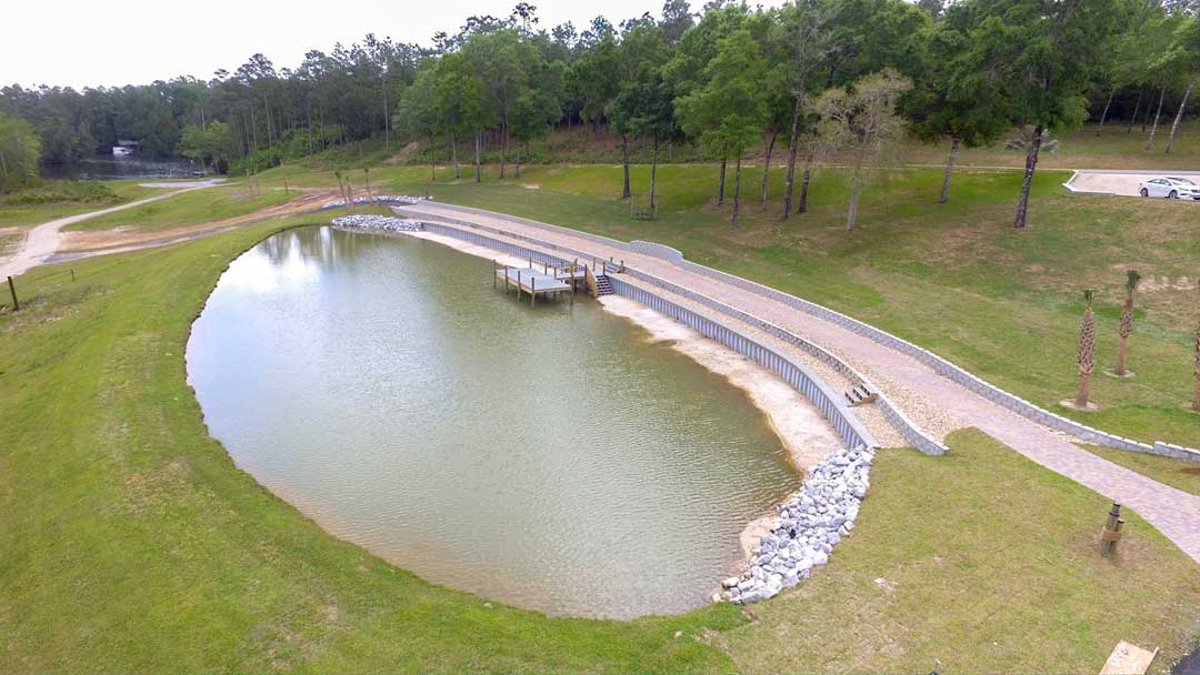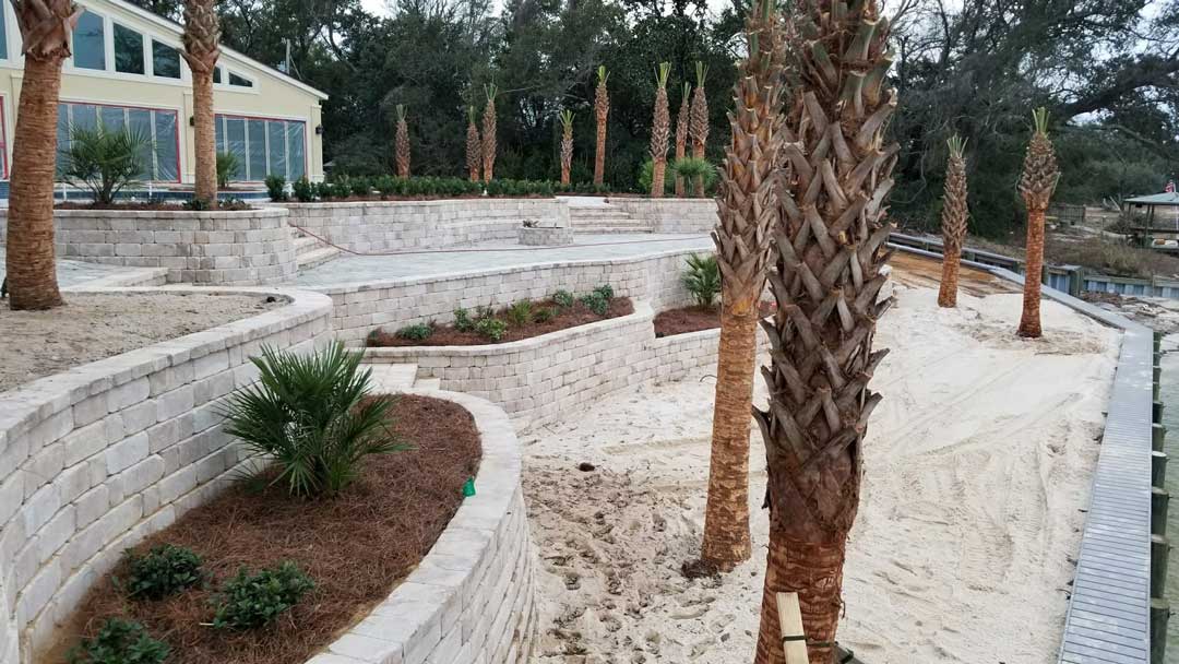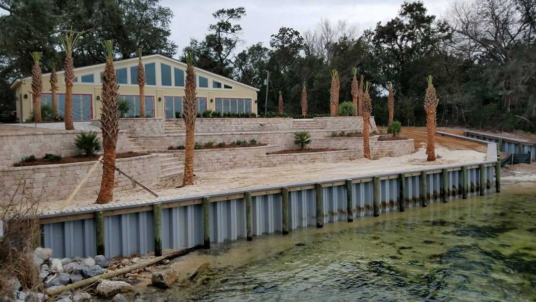 Some of our onland work includes building retaining walls and installing pavers. Retaining walls can be constructed out of vinyl sheet piles, keystone blocking, pressure treated wood, etc. These walls are a good way of controlling erosion on your property or even as decor in areas of steep terrain.
