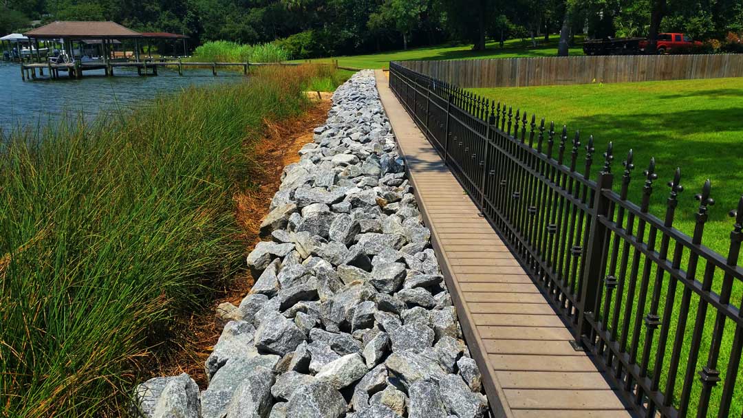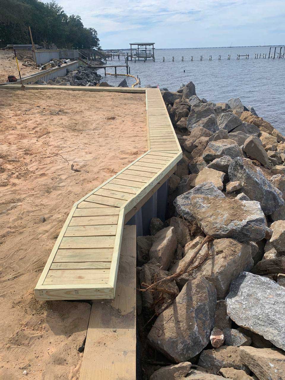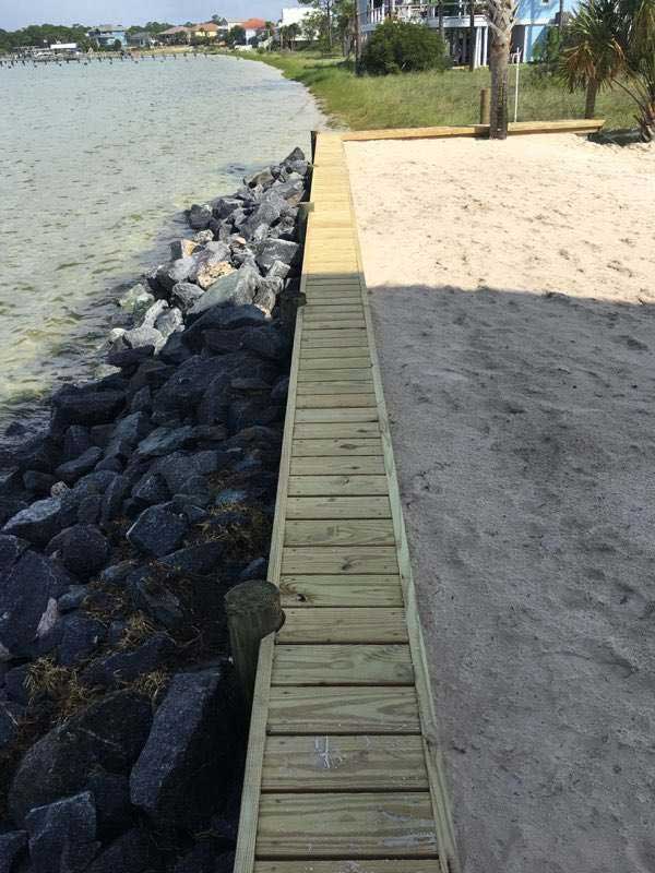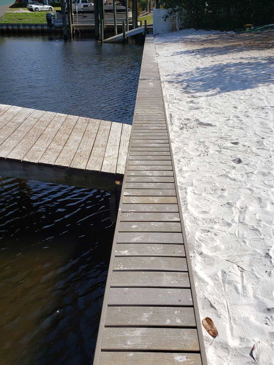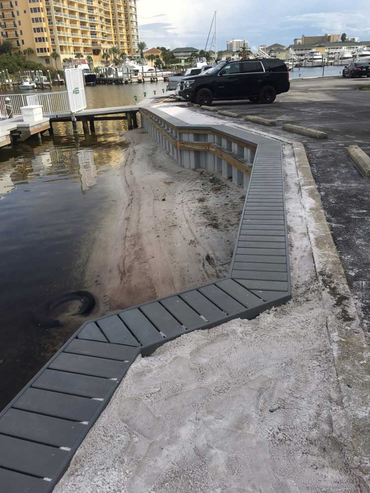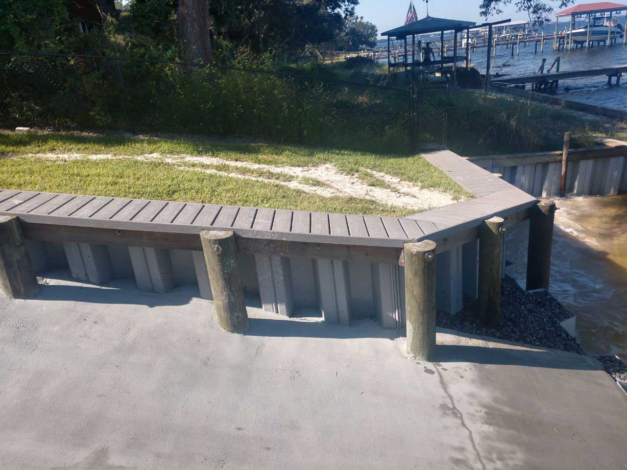 Most of our seawalls are vinyl sheet piles that are either jetted in or vibrated in. Our seawalls usually have a top cap that can be decked with pressure treated wood, hardwood decking, composite decking, or a concrete cap.